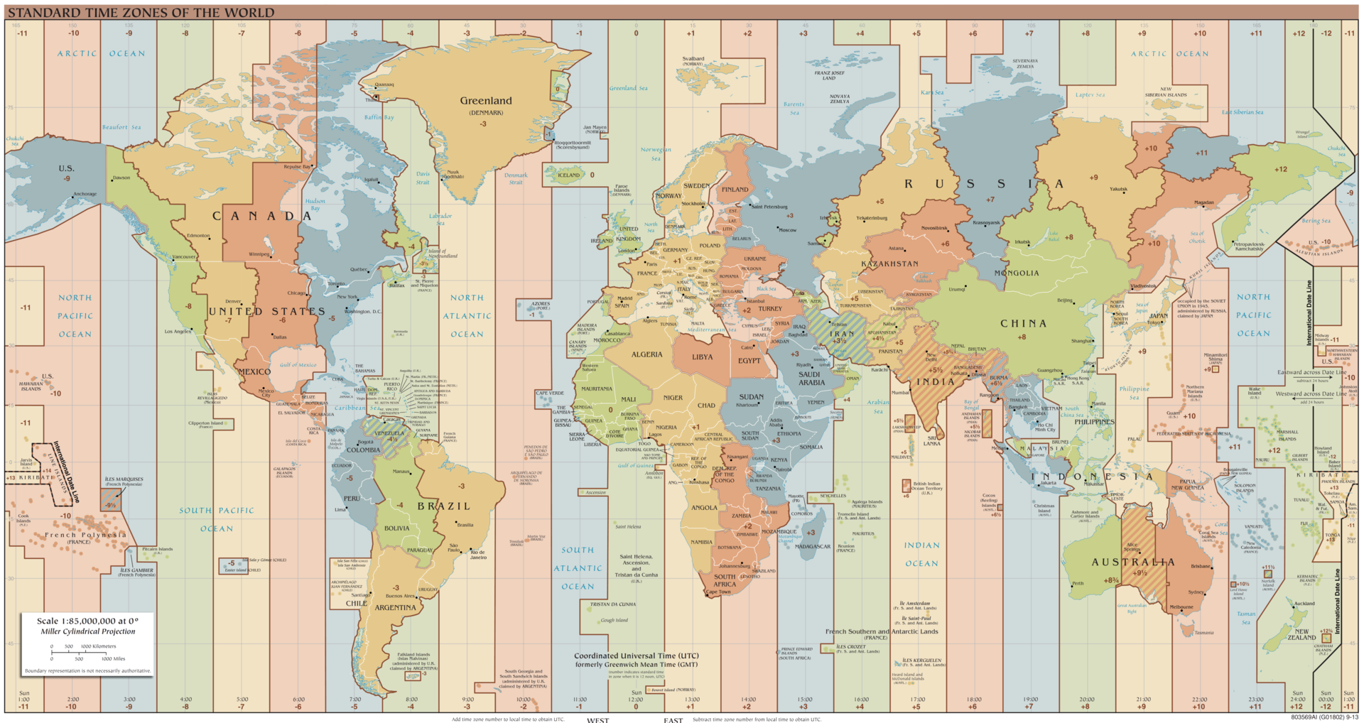 理论时区以被15整除的子午线为中心,向东西两侧延伸7.5度,即每15°划分一个时区,这是理论时区。理论时区的时间采用其中央经线(或标准经线)的地方时。所以每差一个时区,区时相差一个小时,相差多少个时区,就相差多少个小时。东边的时区时间比西边的时区时间来得早。格林威治的0度经线,向东西各延伸7.5度,构成的15度范围组成的时区就是UTC±0,0时区所采用的时间就是格林威治时间,该时间也被采用为国际标准时间度量。东经7.5-22.5度为东一区,以此类推,西半球也采取相同的类推方式。东十二区和西十二区是重合的(172.5E - 172.5W),国际日期变更线(180E/W)从中间穿越。从东向西穿越,日期加1天,西向东穿越,日期减1天。