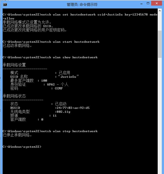 配置承载网络属性,如SSID,密码等 - netsh wlan set hostednetwork ssid=***** key=***** mode=allow|disallow (星号部分为ascii字符,key必须在8-63个字符之间)